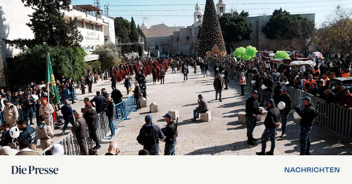 Ein Bild vom 24. Dezember 2025: Eine Blaskapelle spielt bei einer Parade, während Christen aus aller Welt die Geburtskirche in Bethlehem rund um Weihnachten besuchen. Der höchste Vertreter der katholischen Kirche im Heiligen Land, Kardinal Pierbattista Pizzaballa, kam nachmittags an der Spitze der traditionellen Weihnachtsprozession in das Städtchen Bethlehem im Westjordanland. Der Patriarch, der einen roten Umhang, ein rotes Käppchen sowie ein großes goldenes Kreuz auf der Brust trug, zelebriert später in Bethlehem auch die Mitternachtsmesse.