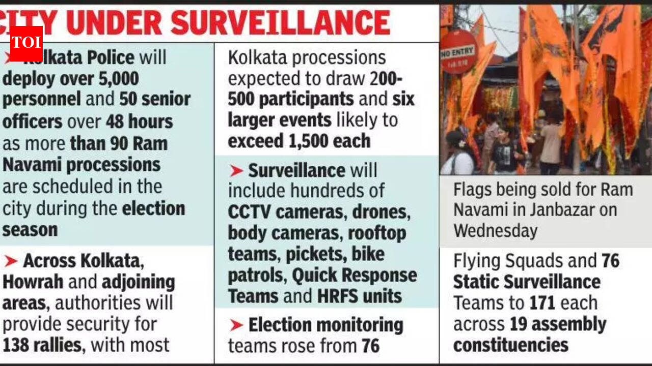 Local police stations have been instructed to clear procession routes of parked vehicles, hawkers and loose construction material, including stones and bricks, before the rallies begin.A senior officer said field units have been directed to remain on the road throughout the processions, act immediately against any hooliganism, maintain close coordination with control rooms and stay in constant touch with organisers and community leaders. The teams have been deployed across the 19 assembly constituencies under Kolkata Police jurisdiction under the supervision of general and police observers.Officials said Flying Squad Teams have been asked to rush to any spot where disturbances are reported and conduct surveillance, while Static Surveillance Teams are manning checkpoints to search suspicious vehicles and individuals. Traffic on the stretch will remain closed from 7 am to 12 pm on the day of the procession, with Foreshore Road serving as the alternative route.Permission for the Howrah procession has been granted subject to Calcutta High Court conditions.