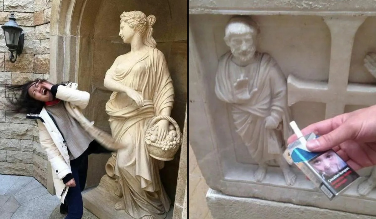 The gesture, the reaction, and the perfect angle make this feel like a public prank frozen in bronze. The room contains 42 life-size bronze statues of the men who were present at the signing of the U.S. Constitution, intentionally placed on the floor level without pedestals to encourage visitors to mingle and take photos with them. A tiny prop gives the stone figure a clear opinion and changes the whole meaning of the image.