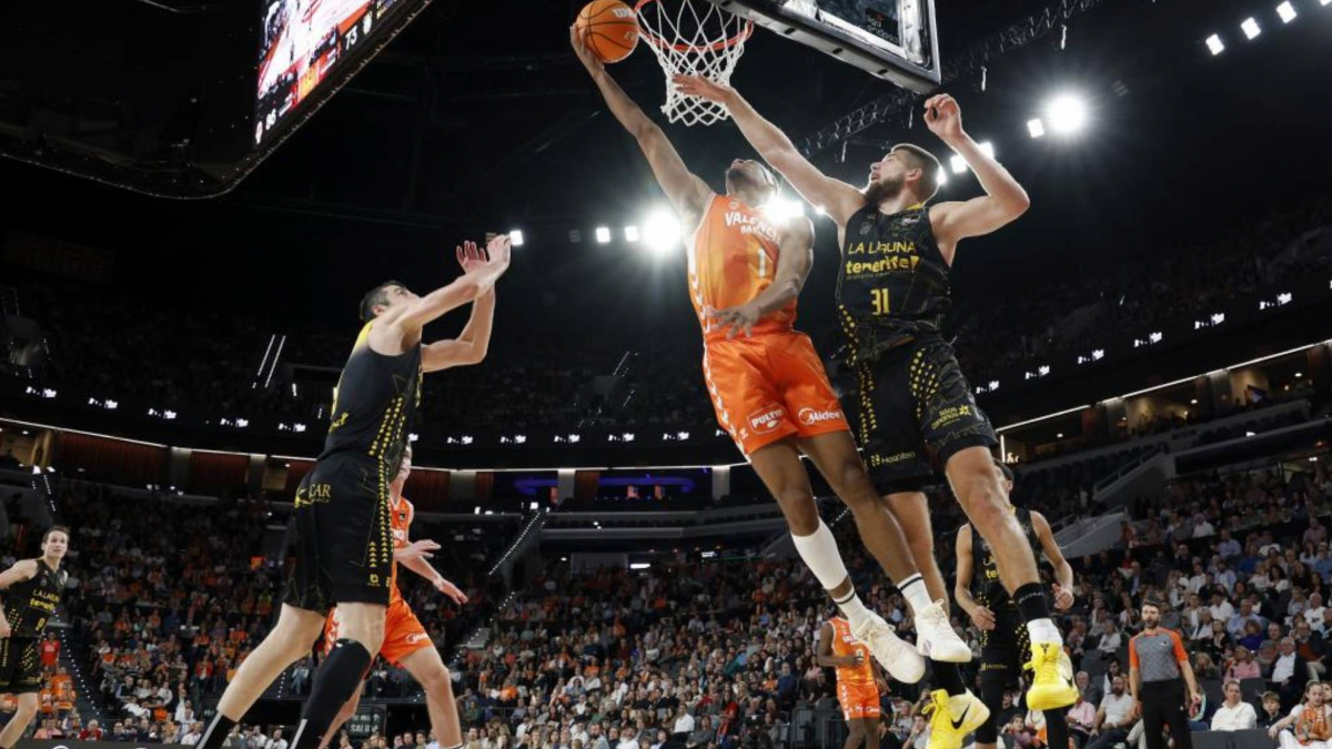 El Valencia Basket, con un notable esfuerzo defensivo, logró este domingo nublar la mirilla de larga distancia del La Laguna Tenerife, que, tras dominar la primera parte con un brillante porcentaje de tiro de tres, perdió puntería y acabó superado en este duelo en la cumbre de la Liga Endesa en el que un certero Kam Taylor lideró los ataques locales. Llegaba el Tenerife como el equipo con mejor porcentaje de tiro de tres de la Liga, un 40,1%, y aunque no se quedó tan lejos, puesto que firmó un 34%, en realidad, tras acertar con 7 de sus primeros 10 tiros, después solo acertó en 5 de los siguientes 25, un decreciente ritmo que marcó el choque. El Tenerife arrancó igualmente la segunda parte tratando de sumar de tres en tres pero, a diferencia de la primera, esta vez erró sus tres primeros lanzamientos y el Valencia, crecido por la influencia de su defensa en esos fallos, asumió el mando, liderado por un sereno Kam Taylor y por el bullicioso Montero (55-47, m.25).