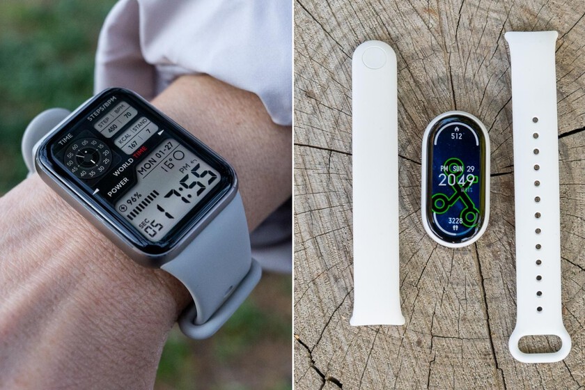 👇 Nuestra recomendada 👇 A tener en cuenta 👇 Calidad-precio Xiaomi Smart Band 9 Pro Huawei Band 10 Xiaomi Smart Band 10 Pantalla 1,74" AMOLED Detección de arritmias Batería de 21 días GPS integrado Gestión emocional Pantalla más brillante Cuerpo de aluminio Ultraligera y fina Infinidad de accesorios 49,90 euros 29 euros 38,70 euros Modelo Lo positivo Lo negativo Precio Samsung Galaxy Fit 3 Acabados en aluminio y detección de caídas Ecosistema cerrado (mejor con móvil Samsung) 44,95 euros Huawei Watch GT 6 Diseño exquisito y sensores de salud top Sistema cerrado sin pagos universales 239 euros Xiaomi Watch S4 Pantalla excelente y bisel intercambiable Notificaciones y pagos limitados 90 euros Amazfit Balance 2 Pagos Zepp Pay y medición corporal Precio elevado 266,99 euros CMF Watch 3 Pro Diseño único y GPS doble banda Materiales más sencillos 79 euros Lo que la diferencia del resto es su calidad de construcción: abandona el plástico por un cuerpo de aluminio que se siente muy robusto y elegante, acercándose a la sensación de llevar un Apple Watch en miniatura.
