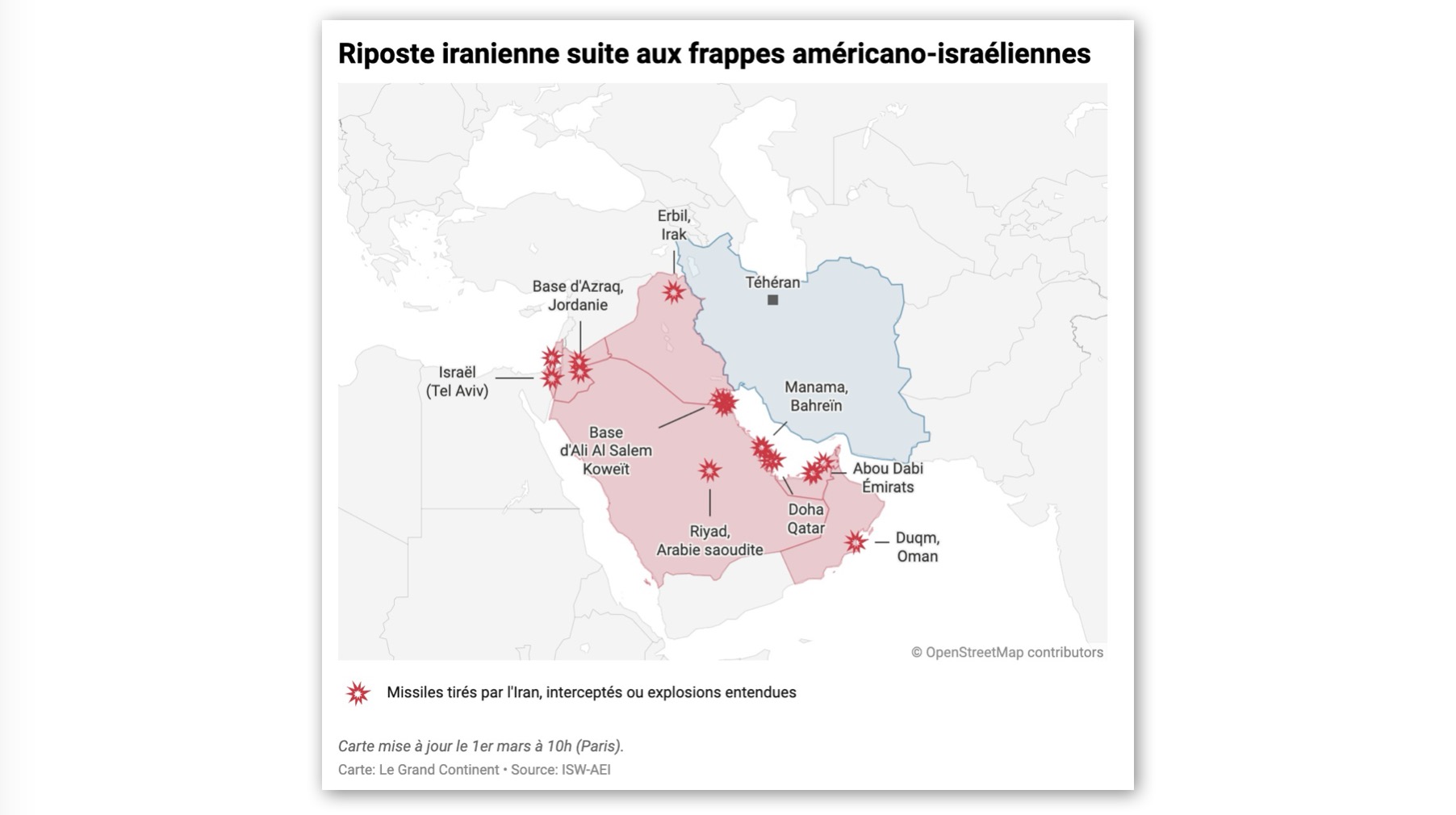 Un dépôt de missiles du Corps des gardiens de la révolution situé dans le périmètre de l’aéroport international Mehrabad, en plein cœur de Téhéran, a été visé par une frappe de missile. Des explosions auraient également eu lieu près du quartier-général des Gardiens de la révolution, du ministère du Renseignement et de la Sécurité et du siège du Commandement des forces de l’ordre, dans le cœur de la capitale. Dans un message sur les réseaux sociaux, le 1er mars, Donald Trump a mis en garde l’Iran contre des frappes de représailles, déclarant : « L’Iran vient de déclarer qu’il allait frapper très fort aujourd’hui, plus fort qu’il ne l’a jamais fait auparavant […] Ils feraient mieux de ne pas faire ça parce que s’ils le font, nous les frapperons avec une force qui n’a jamais été vue auparavant !