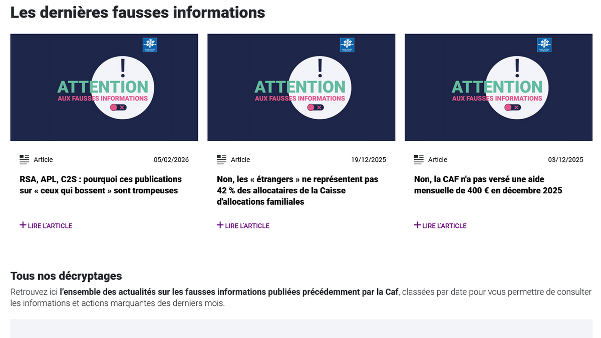 L'espace unique rassemble des articles de " désintox " qui répondent factuellement aux rumeurs les plus fréquentes, comme celle d'une prétendue aide mensuelle de 400 euros ou une vidéo virale qui affirme que les étrangers représentent 42 % des allocataires de la Caf. La collaboration inattendue doit permettre de toucher un large public, notamment sur les réseaux sociaux, et l'inciter à vérifier une information sur le site officiel avant de la partager. En cas de doute, la marche à suivre est de ne pas relayer l'information, vérifier la source, et consulter systématiquement caf.fr ou les comptes officiels de la Caf.