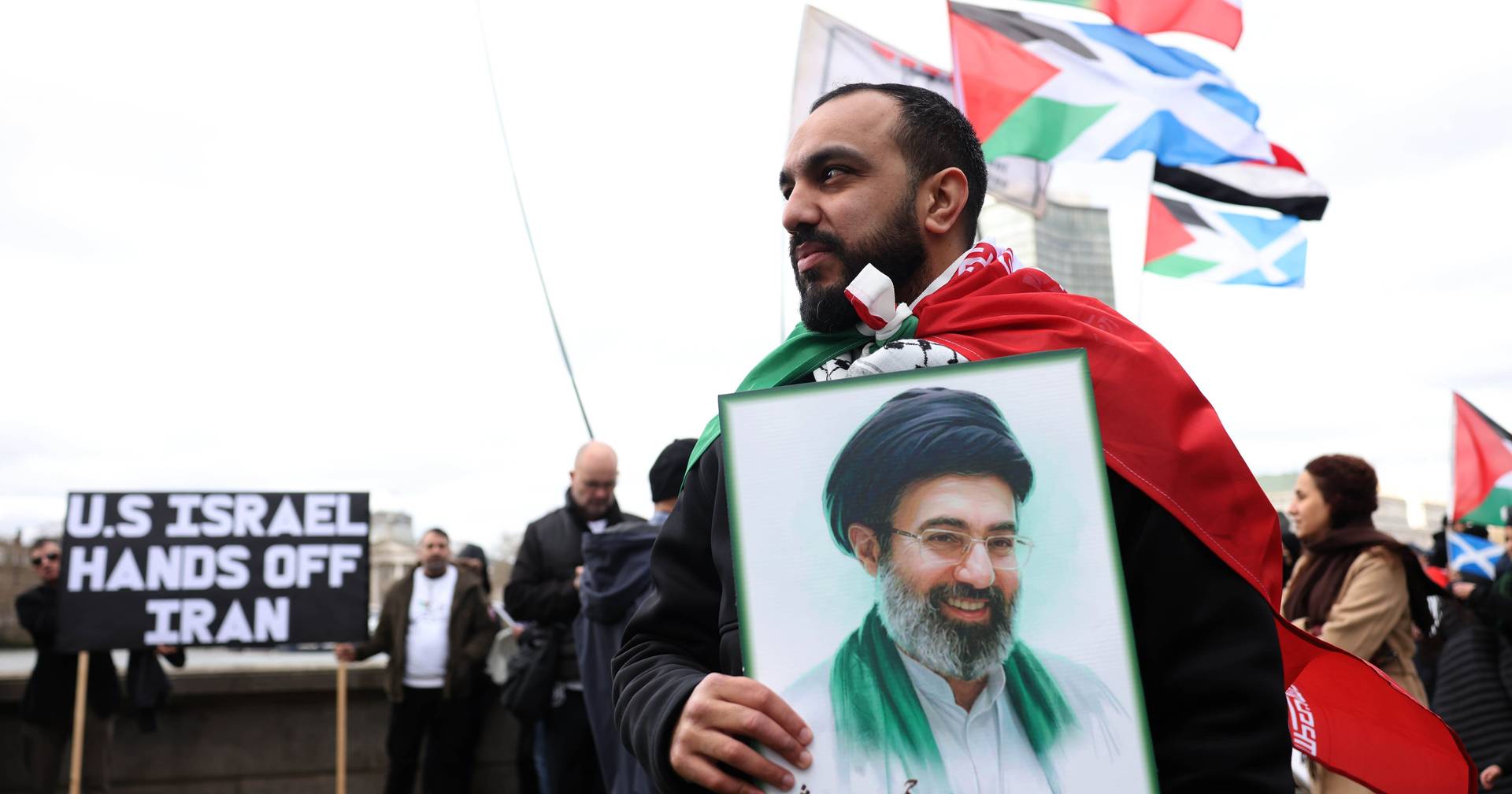 Segundo a agência Efe, que cita fontes policiais, foram cerca de cinco mil os apoiantes do regime de Teerão que se juntaram nas margens do rio Tamisa para uma marcha organizada pela Comissão Islâmica de Direitos Humanos (IHRC, em inglês) e exibiram cartazes com o rosto do falecido aiatola iraniano Ali Khamenei, do filho, o novo líder supremo da República Islâmica, Mojtaba Khamenei, acompanhados da frase "Escolhe o lado certo da história". Ao mesmo tempo, do outro lado do rio, e separados por um enorme cordão policial de agentes, camiões e até barcos, decorreu uma contramanifestação organizada pelo grupo pró-israelita 'Stop The Hate', com apenas uma centena de pessoas, onde se podiam ler cartazes com 'slongs' como "Hamas terrorista", ao lado de bandeiras de Israel, dos Estados Unidos ou das imperiais do Irão, com o leão no centro. Para evitar o confronto entre os manifestantes, a Polícia Metropolitana de Londres encerrou o trânsito numa das pontes próximas ao local e, segundo a Efe, as duas manifestações decorreram com relativa normalidade, resultando em apenas três detenções: uma por "manifestação de apoio a uma organização proibida, outra por condução imprudente e outra por comportamento ameaçador e abusivo", indicaram as autoridades na rede social X, cita a Efe.